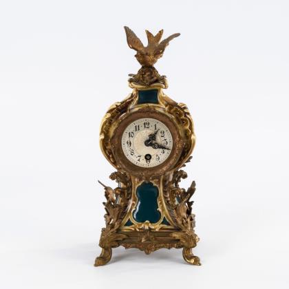 Unterglasurbemalung in Petrol und Braun. Rocaillegehäuse, Uhr mit arabischen Ziffern, prunkvolle Bronzemontierung mit einem Vogel als Bekrönung