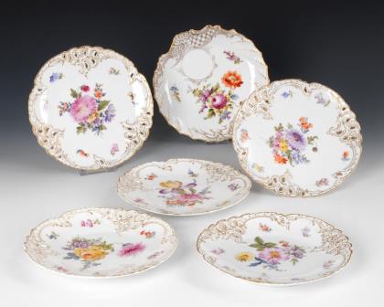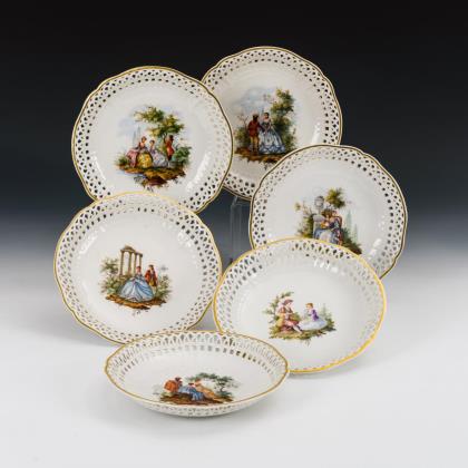 5 Teller mit Rocailledurchbruch am Rand, 1 große Untertasse mit Rocaillerelief