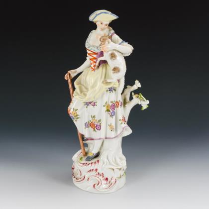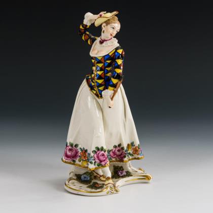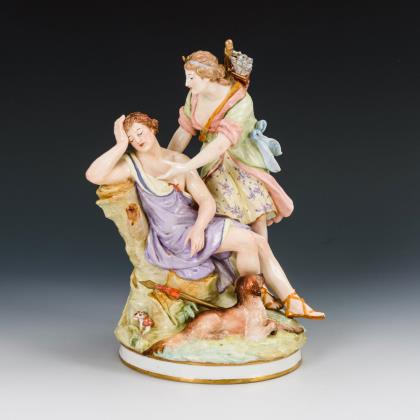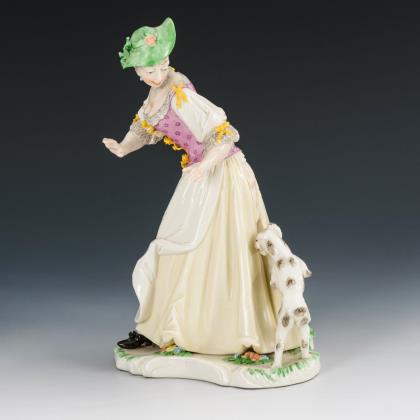 Auf einem Rocaillesockel stehende Dame, sich nach einem ihr Kleid zerreißenden Hund umschauend