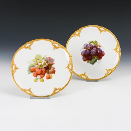 Teller mit goldbronziertem Rocaillereliefrand, im Spiegel Fruchtmalerei: 1x ein Traubenzweig, 1x Erdbeerbukett