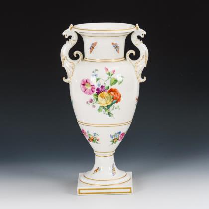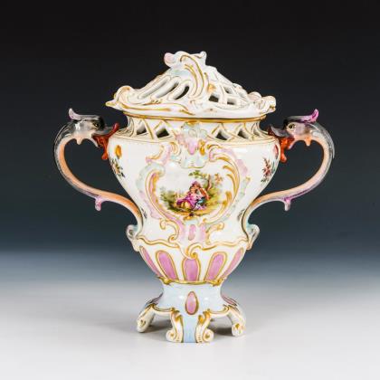 Balustervase mit zwei Drachenkopfhenkeln, Rocaillerelief sowie durchbrochener Schulter und Deckel. Beidseitig eine galante Szene