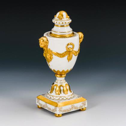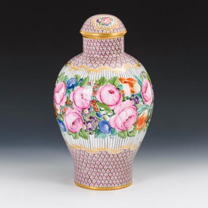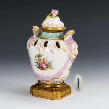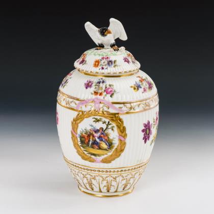 Kannlierte Vase mit Adlerknaufdeckel. Beidseitig eine lorbeergerahmte Kartusche mit figürlichen Szenen nach Watteau
