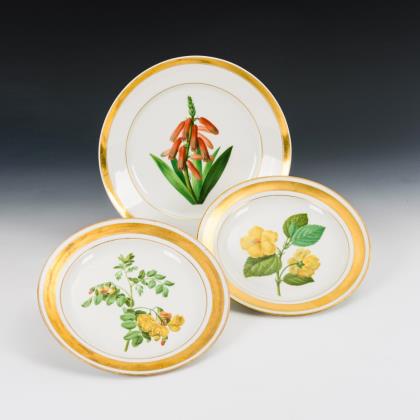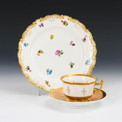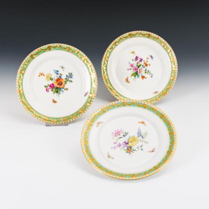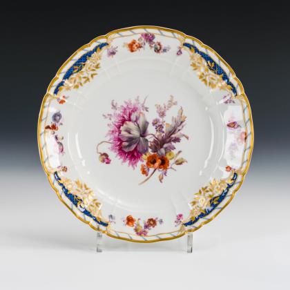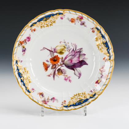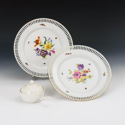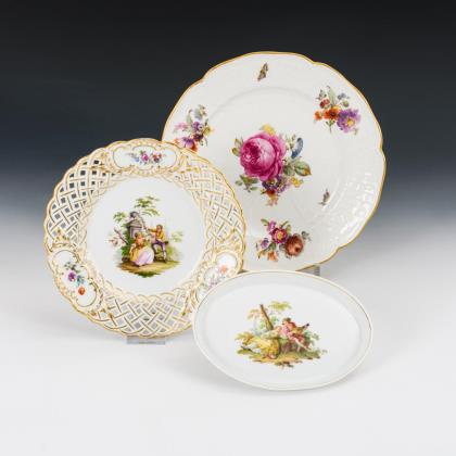 1x KPM Berlin: Speiseteller in der Form "Reliefdekor mit Spalier", Blumenmalerei (Ø 25,5 cm). / 2x Meissen, 1x mit 2 Schleifstrichen: Druchbruchteller (Ø 21 cm) und ovales Tablett (L 18 cm)