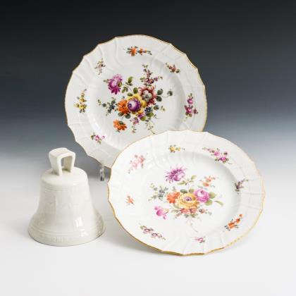 2 Teller in der Form "Neuozier" (Ø 21 cm) und 1 Tischglocke mit der Reliefumschrift "That this World under God shall have a new Birth of Freedom" (H 11,5 cm)