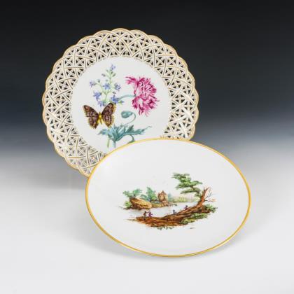 1x Wandteller mit der Darstellung einer Flusslandschaft mit Personenstaffage (Ø 25,5 cm). / 1x Teller mit Korbdurchbruch, im Spiegel die Darstellung von Federmohn, Hyazinthe und einem Schmetterling