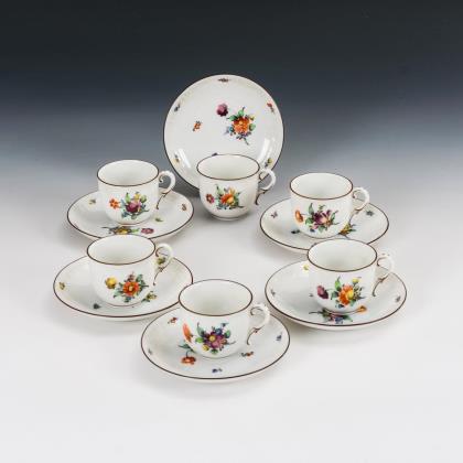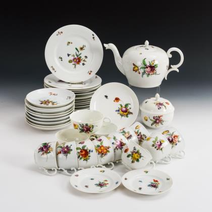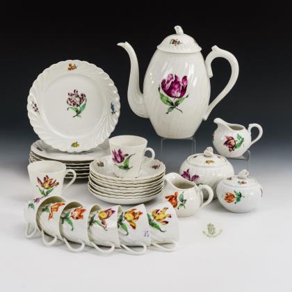 39 Teile. Teekanne (H 14 cm), Zuckerdose, 10 Kaffeetassen, 3 Teetassen, 10 Untertassen (diese in unterschiedlicher Scherbenstärke), 12 Frühstücksteller und 2 Konfektteller