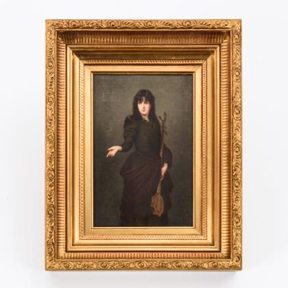 Darstellung einer jungen Frau mit Saiteninstrument, die Hand bittend ausstreckend, nach einem Gemälde von Nathaniel Sichel (1843-1907)
