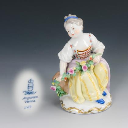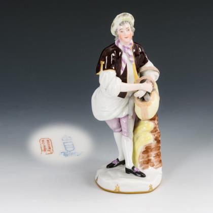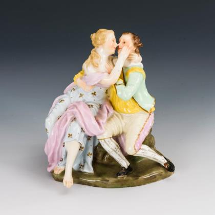 Auf einer Rocailleplinthe angeordnete Gruppe einer auf einer Steinbank sitzenden,