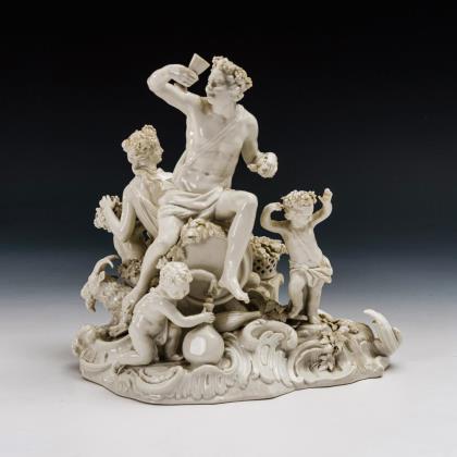 Auf einem Weinfass sitzender Bacchus mit Leopardenfell und Glas, hinter ihm die von Putten mit Weinflaschen und -bechern sowie einem Ziegenbock umgebene Ariadne