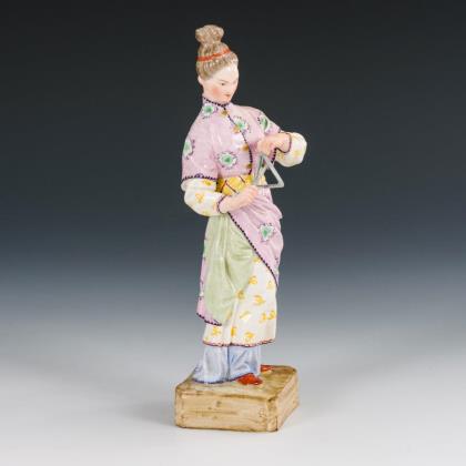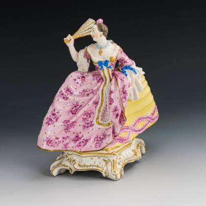 Auf einem Rocaillesockel stehende Rokokodame im Reifrock, einen Fächer haltend