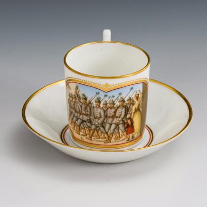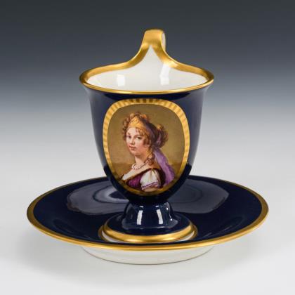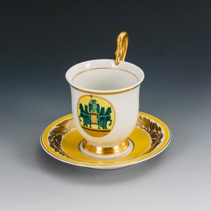 Gefußte Glockentasse mit Schwanenhalshenkel. Schauseitig ein Medaillon mit der Darstellung der Quadriga des Brandenburger Tores in Berlin, Untertasse mit gelbem Fond und goldenem Lorbeerlaubkranz