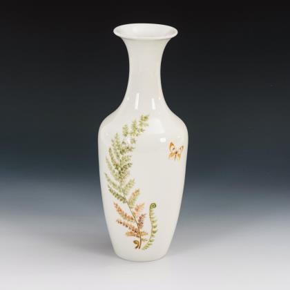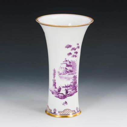 Gedrungene Balustervase mit schlankem Hals, weit geöffneter Mündung in Form von Blättern, zwei Henkeln und gemuscheltem Fuß. Blauer Fond, schauseitig die bezeichnete Ansicht der Stadt Hannover, verso ornamentale Goldmalerei