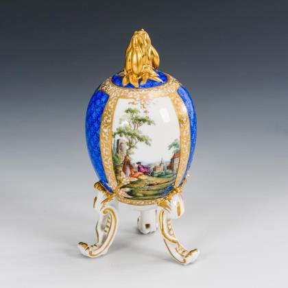 Ovoide Dose mit Flammenknaufdeckel, auf drei Rocaillefüßen. Auf der Wandung alternierend angeordnete Felder mit blauem Schuppenmuster sowie Felder mit Watteaumalerei
