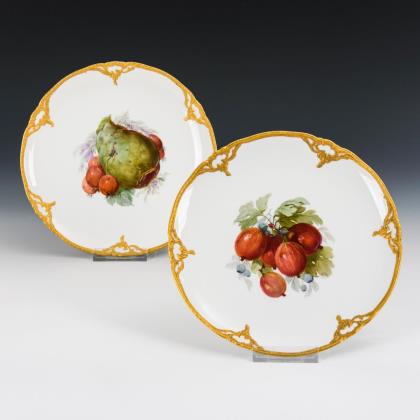 Teller mit goldbronziertem Rocaillereliefrand und Fruchtmalerei: 1x Feige mit Mispeln, 1x Stachelbeeren und Heidelbeeren