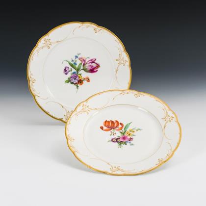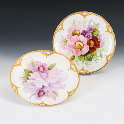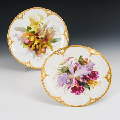 Teller mit goldbronziertem Rocaillereliefrand und Blumenmalerei: 1x Orchideen, 1x Heckenrosen