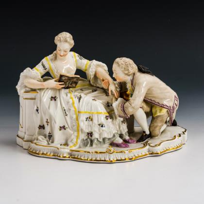 lesenden Rokokodame sowie eines zu ihrer Rechten sich verbeugenden, die Hand