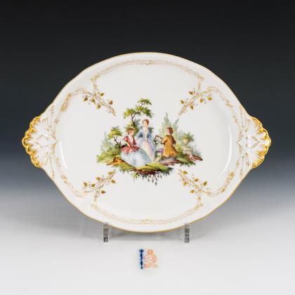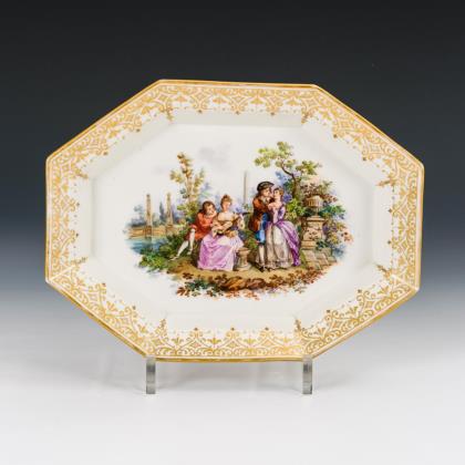 Oval-achteckige Schale mit einer galanten Parkszene im Spiegel und Goldbordüre
