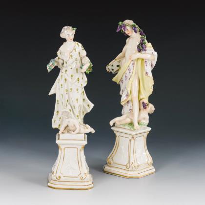1x figürliche Allegorie des Frühlings, 1x figürliche Allegorie des Herbstes, beide auf reliefierten Postamenten
