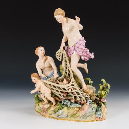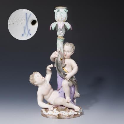 Modell von Johann Joachim Kaendler und Friedrich Elias Meyer 1749. Vollplastisch modellierter Figurenschaft mit Delphin und Amoretten. Farbig bemalt, gold staffiert. Ritzmarke, Pressmarke, Malermarke, Schwertermarke 1. Wahl