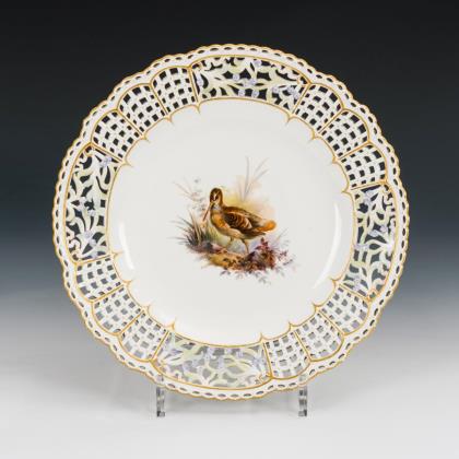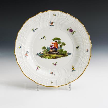 Teller in der Form "Neuer Ausschnitt" mit stabdurchbrochener Fahne, auf Rundfuß. Im Spiegel zwei kleine Parklandschaften mit einer galanten Szene