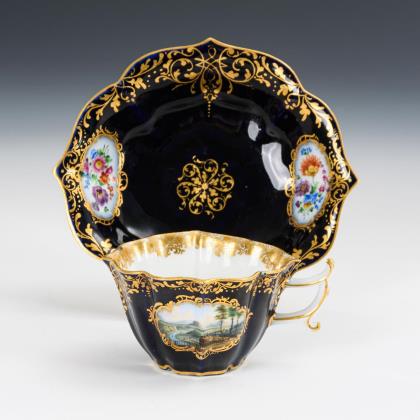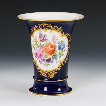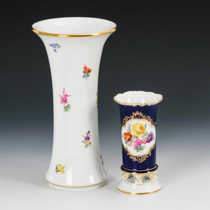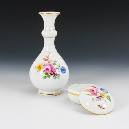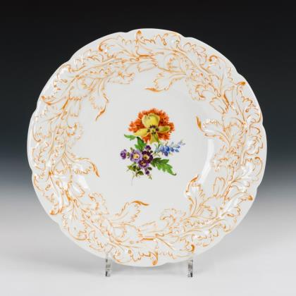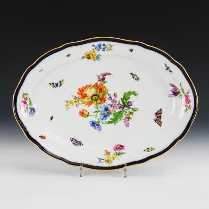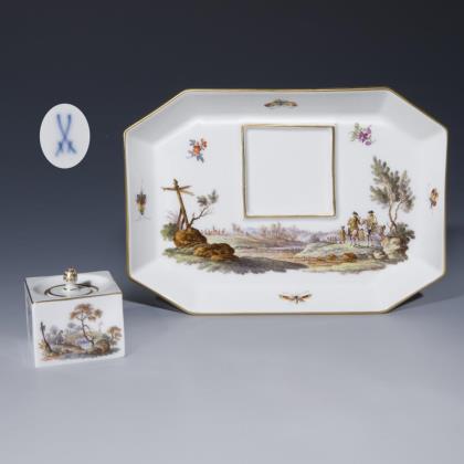 Allseits sehr feine farbige Bemalung mit Einzelblüten, Blumenbuketts, Insekten und drei verschiedenen Jagdszenen nach Vorlagen von Johann Elias Ridunger. Goldstaffage. Pressmarken, Malermarken, Schwertermarken 1. Wahl