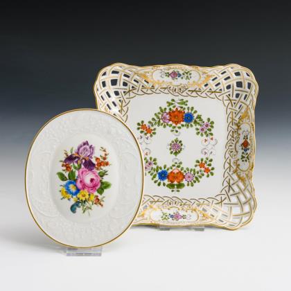 Quadratschale mit Korbdurchbruch und indianischer Blumenmalerei (20,5 x 20 cm) und Ovalplakette mit dem Reliefdekor "Marseille" (L 16,5 cm)