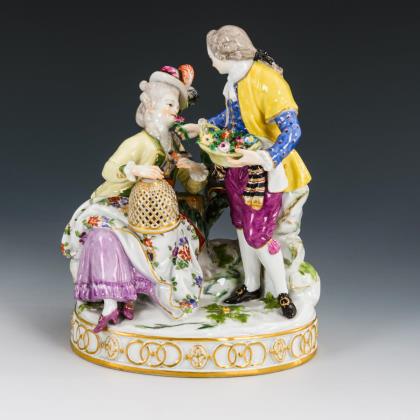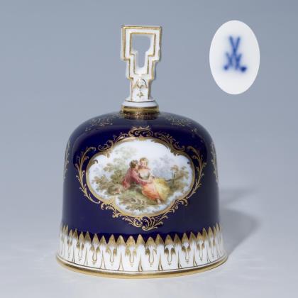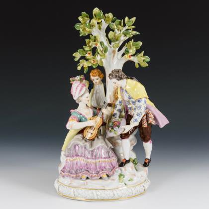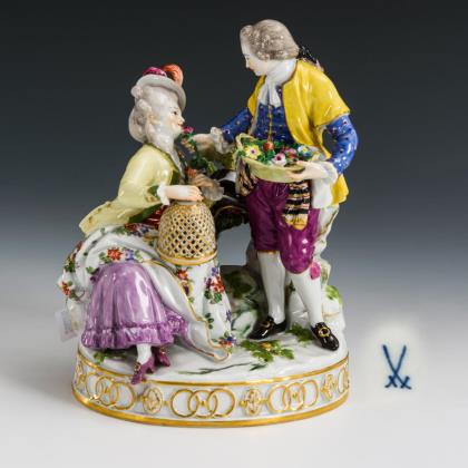 Modell von Ernst August Leuteritz (unter Verwendung alter Formen). Gold staffiert. Gesichter farbig staffiert. Vollplastischer Figurenschaft mit Gärtnerfiguren. Ritzmarken, Pressmarken, Malermarken, Schhwertermarken 1. Wahl
