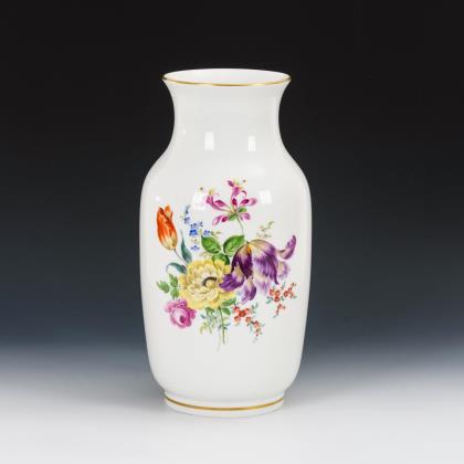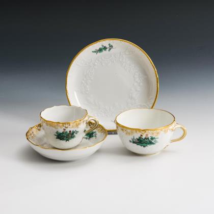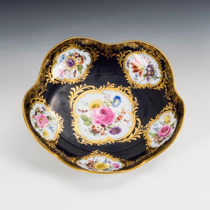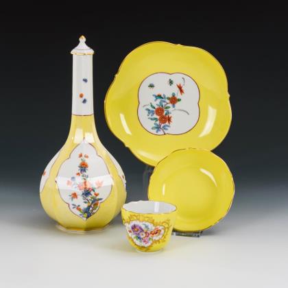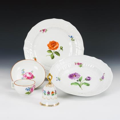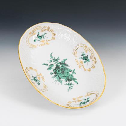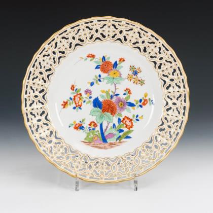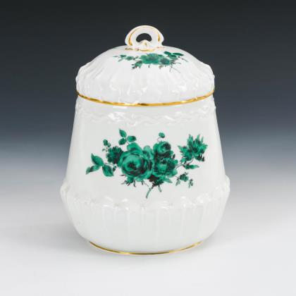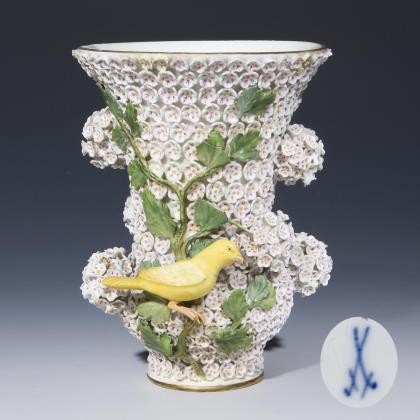 Modell von Johann Joachim Kaendler 1760. Die gesamte Oberfläche mit purpur-gelb staffierten Blüten belegt. Seitlich je drei Schneeballen. Beidseits plastisch aufgelegte Zweige mit je einem Vogel, naturalisch bemalt. Ritzmarke, Pressmarke, Malermarke, Schwertermarke 1. Wahl
