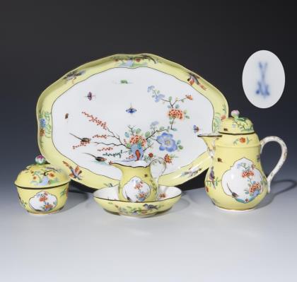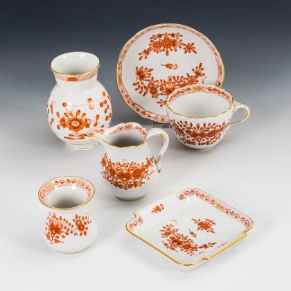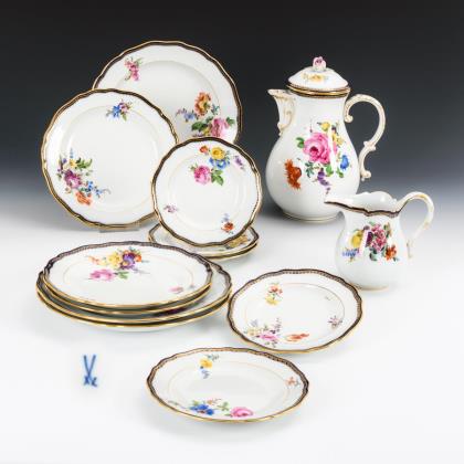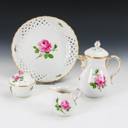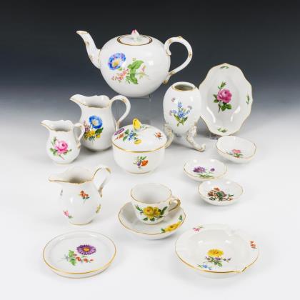 14 Teile. Form "Neuer Ausschnitt". Teekanne (H 13 cm), 3 verschiedene Milchkännchen, Zuckerdose (H 10 cm), Eidose (ohne Deckel, H 13 cm), Mokkatasse mit Untertasse, 1 Ascher, 2 Nussschälchen, 2 Vierpassschalen und 1 Untersetzer