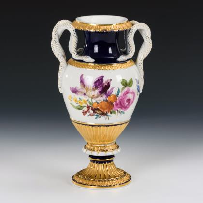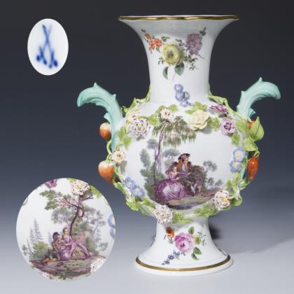 Beidseits feine farbige Bemalung mit "Watteauszenen". Umlaufend farbige Blumenbemalung, plastisch aufgelegte, naturalistisch bemalte Blüten und Früchte, aus denen seitlich Ast-Handhaben wachsen. Gold staffierte Ränder. Pressmarken, Schwertermarke 1. Wahl