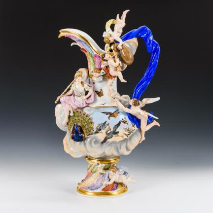 Große Vase in Form einer Schenkkanne mit Feder-, Vogel- und Wolkenrelief, Putten, auf der Schulter die Göttin Juno als Personifikation der Luft sitzend
