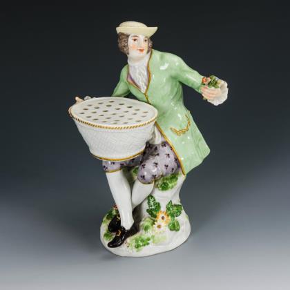 Auf einem Felssockel sitzender Gärtner, einen Korb mit durchbrochenem Deckel tragend