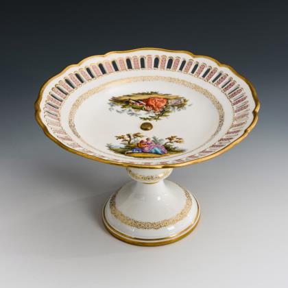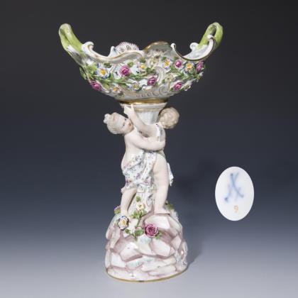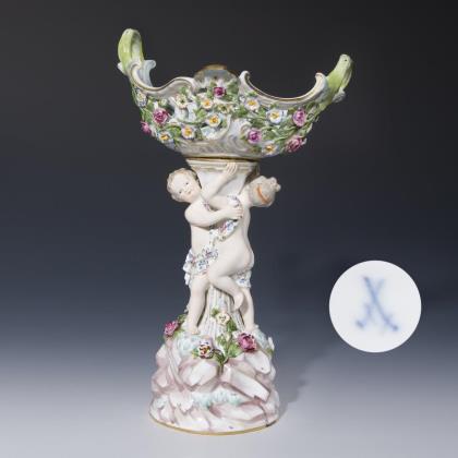 Die durchbrochen gearbeitete Schale und Sockel umlaufend mit plastisch aufgelegten Blütenzweigen. Figurenschaft mit Amoretten auf Fels-Sockel. Farbig bemalt, gold staffiert. Ritzmarke, Malermarke, Schwertermarke 1. Wahl