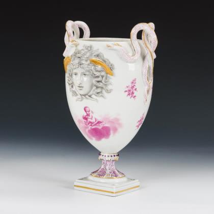 Ovoide Form mit zwei Schlangenhenkeln sowie zwei Medusenmaskaronen, Rundfuß, Quadratplinthe. Purpurfarbene Putten- und Blumenmalerei