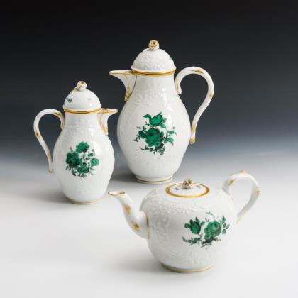 Teekanne, Zuckerdose und Gedeck mit kupfergrüner Blumenmalerei