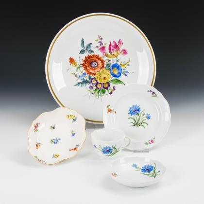 Form "Neuer Ausschnitt", 1x Form "Neubrandenstein. Überwiegend Streublümchenmalerei, 2x Blumen- und Insektenmalerei. Kaffeekanne (H 26 cm), Milchkännchen, 1 + 1 Zuckerdosen, 6 Kaffeetassen, 12 Untertassen, 6 + 5 + 6 + 3 Teller, 1 Ovalschale und 1 Rundschale