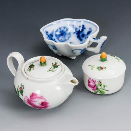 Teekännchen (H 6 cm) und Dose (H 4,5 cm) mit Rosenmalerei. / Zwiebelmuster-Blattschälchen (Ø 8,5 cm)