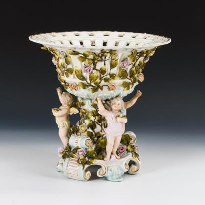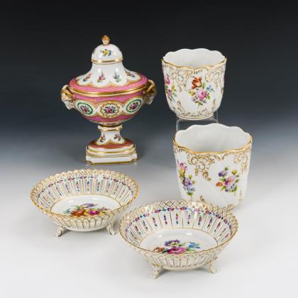 2 Durchbruchschalen mit vier Füßen (Ø 16,5 cm), 2 Blumenübertöpfe mit Rocaillerelief (H 10 und 11,5 cm) sowie 1 Deckelvase mit Widderkopfhandhaben (H 22 cm)