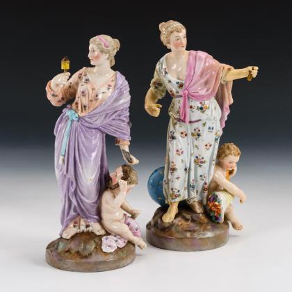 1x Allegorie der Klugheit mit Schlange und Maske. / 1x Allegorie der Vorsehung mit Füllhorn und Himmelskugel. Beide verso am Sockel bezeichnet