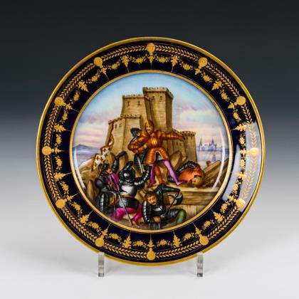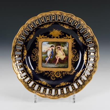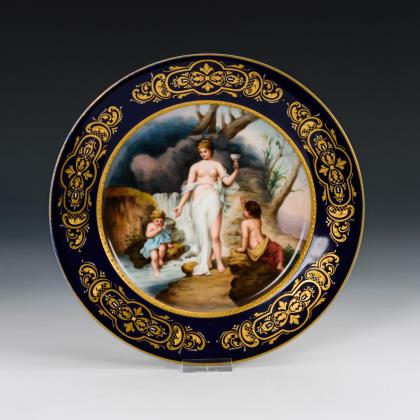 Teller mit Goldrelief- und Juwelenmalerei auf der kobaltblauen Fahne. Im Spiegel die Darstellung einer an einer Quelle stehenden Nymphe mit Pokal sowie zwei Amoretten, unterseitig bezeichnet "Quellennymphe"