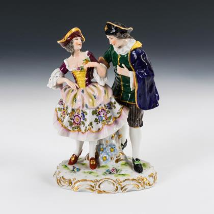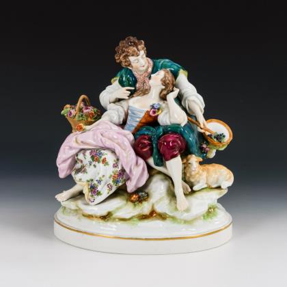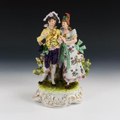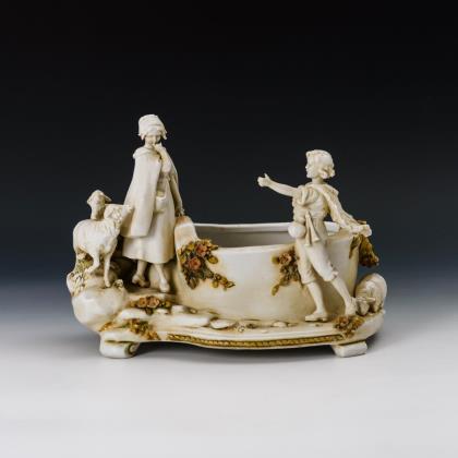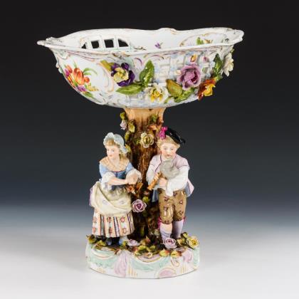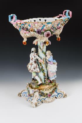 Durchbruchschale mit Blütenbelag, auf Eichenstammschaft mit einem vor dem Schaft sitzenden Schäferpaar