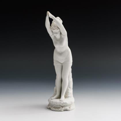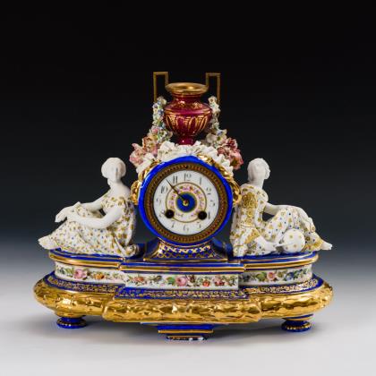 Werknummer: 783. Werk mit Halbstundenschlag auf Glocke. Herstellerprägung Werk: Ungemarkt. Weißes Emailzifferblatt mit arabischen Zahlen, Minuterie und Romaines-Zeiger. Porzellan, farb- und goldstaffiert. Blumenstaffierter Sockel im Louis Seize-Stil mit weiblichen Allegorien der Freien Künste. Werk läuft an