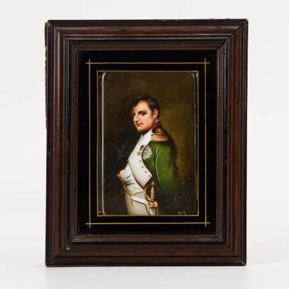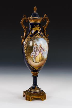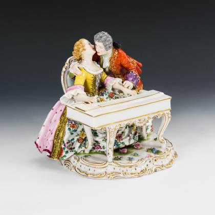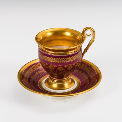 Zylindertasse mit Rosenknaufdeckel. Purpurfarbener, blauer und goldener Teilfond, reich reliefgoldbemalt. Schauseitig eine Rechteckkartusche mit der Darstellung des unter einem Baum sitzenden Liebespaares Eduard und Kunigunde, unterseitig bezeichnet. Nach einem um 1815 entstandenen Bänkellied, das sich schnell verbreitete und zum Jahrmarktsschlager wurde