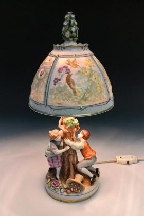 Halbovoider Schirm mit vier Frühlingsmotiven als Lithophaniebilder, Baumstammschaft mit zwei um den Schaft Fangen spielenden Kindern. Elektrifiziert