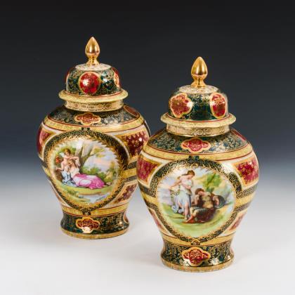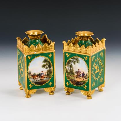 Quadratische Dosen mit Lanzettblattrand, durchbrochenem Deckel sowie Tatzenfüßen mit geflügelten Löwenköpfen. Grüner Fond mit feiner, teils gravierter Goldreliefmalerei. Beidseitig ein Medaillon mit der qualitätvollen Malerei von Küstenlandschaften bzw. einer Landschaft mit Bauernpaar mit Vieh