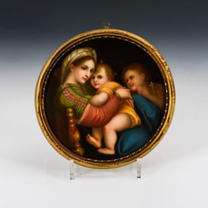 Runde Platte mit der Darstellung der Gottesmutter Maria mit dem Christusknaben sowie dem Johannesknaben, nach dem 1513 entstandenen Gemälde des italienischen Malers Raffael (1483-1520)