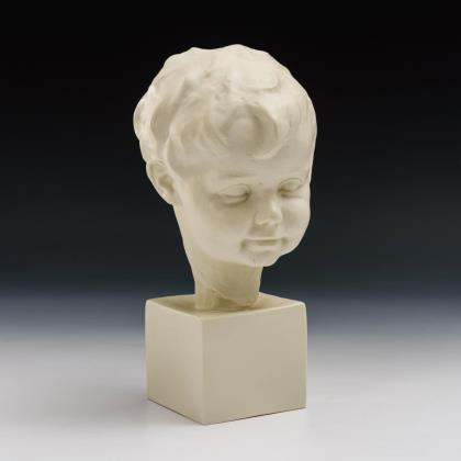Auf einem Quader ruhende Plastik eines Kinderkopfes