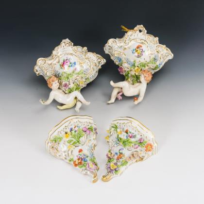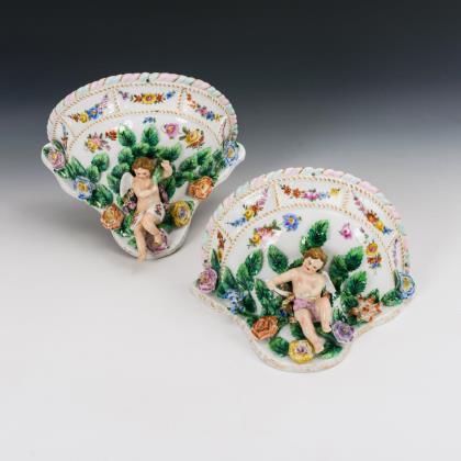 2x Rocaillekonsolen mit Blütenbelag. / 2x Rocaille-Wandvasen mit Putto und Blütenbelag
