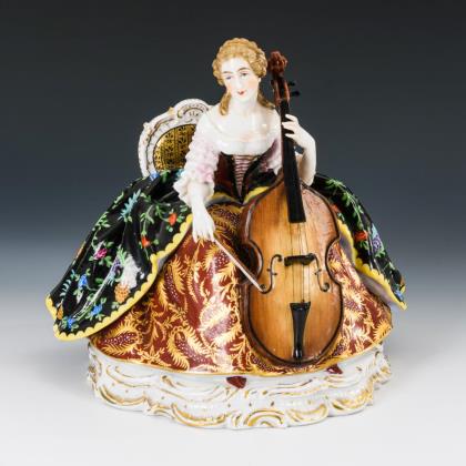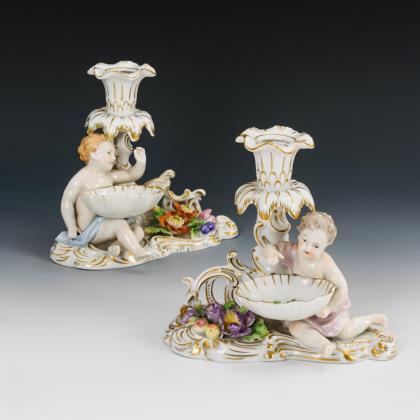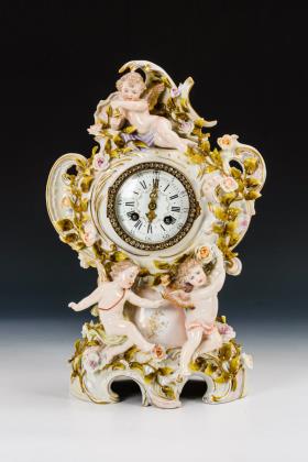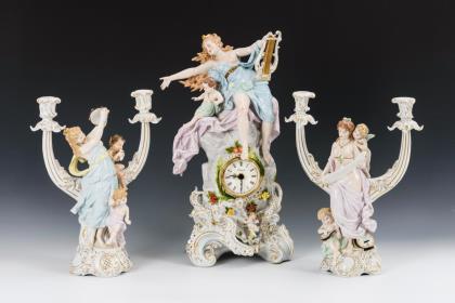 Uhr mit Rocaillegehäuse, zwei Putten und Dame mit Lyra, Quartzuhrwerk. / 2 2-flammige Leuchter mit singender Frauenfigur bzw. Frauenfigur mit Tamburin