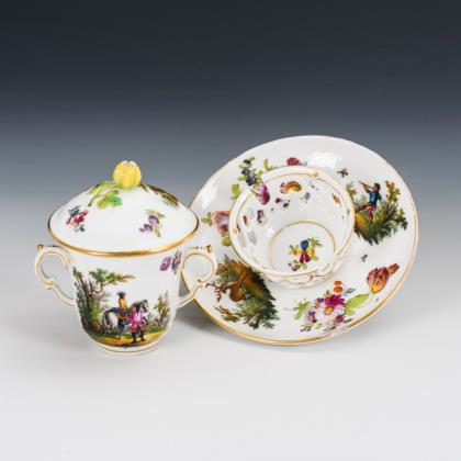 Deckeltasse mit zwei Henkeln und Untertasse mit durchbrochenem Standring
